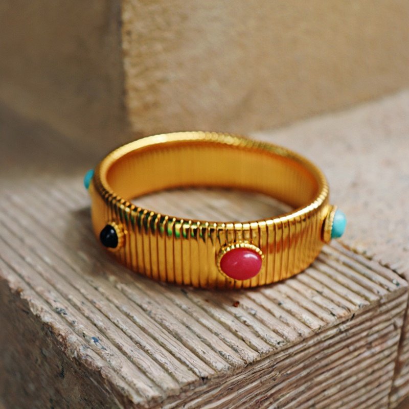 Obsessed with this vintage-inspired bracelet! The gold wire-drawing texture is so unique—feels like a piece from a luxury jewelry box. The pop of red coral and turquoise stones adds such a fun, retro vibe without being over-the-top. It’s lightweight but sturdy, and the stretchy design makes it easy to slip on/off. Got compliments the first time I wore it to brunch! Packaged beautifully too—definitely worth every penny for the craftsmanship.